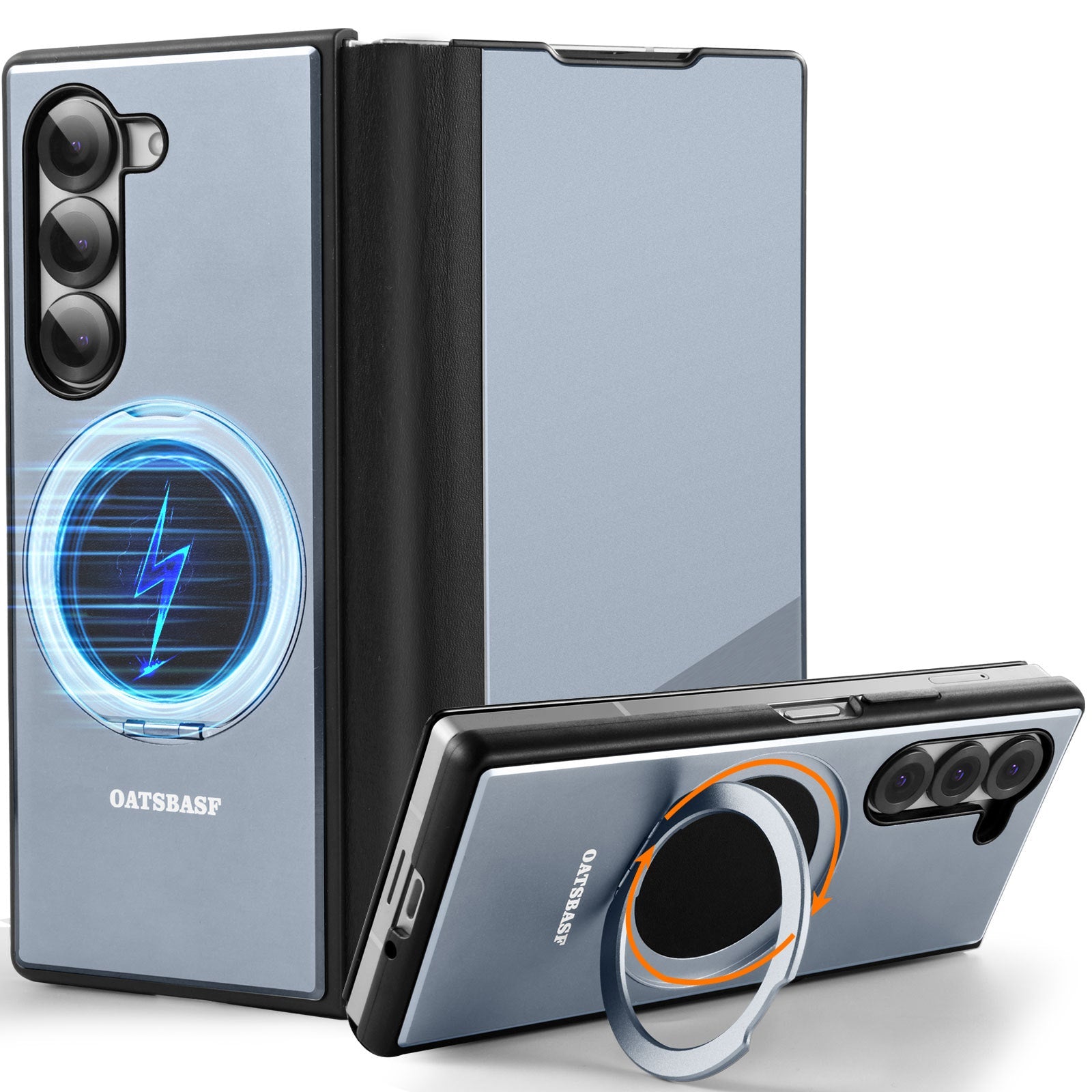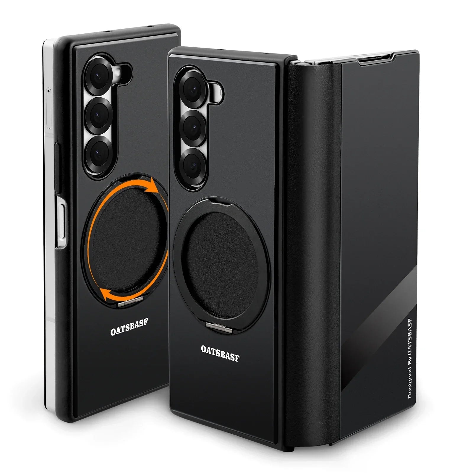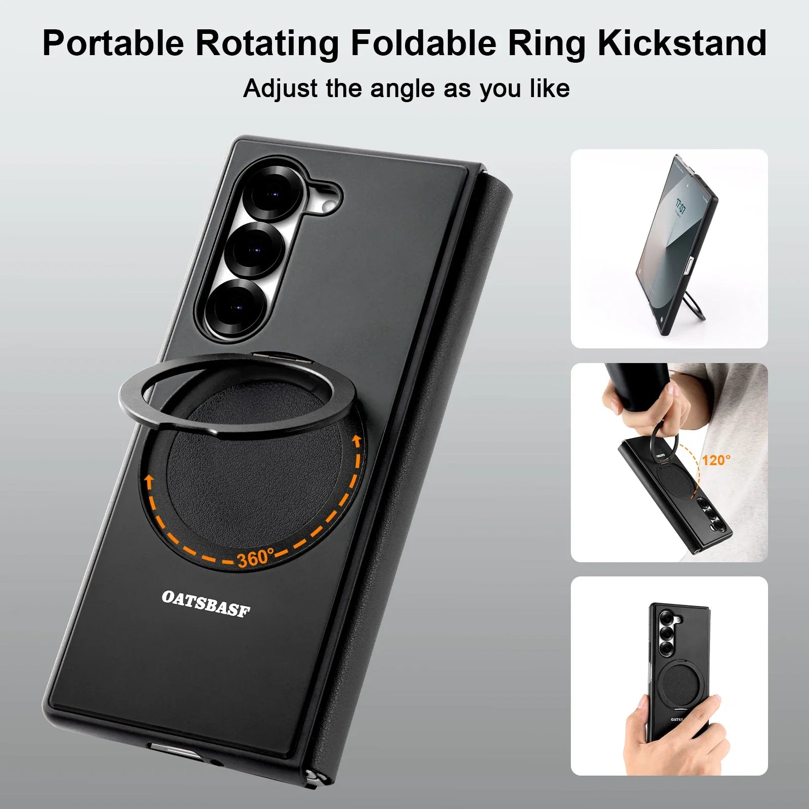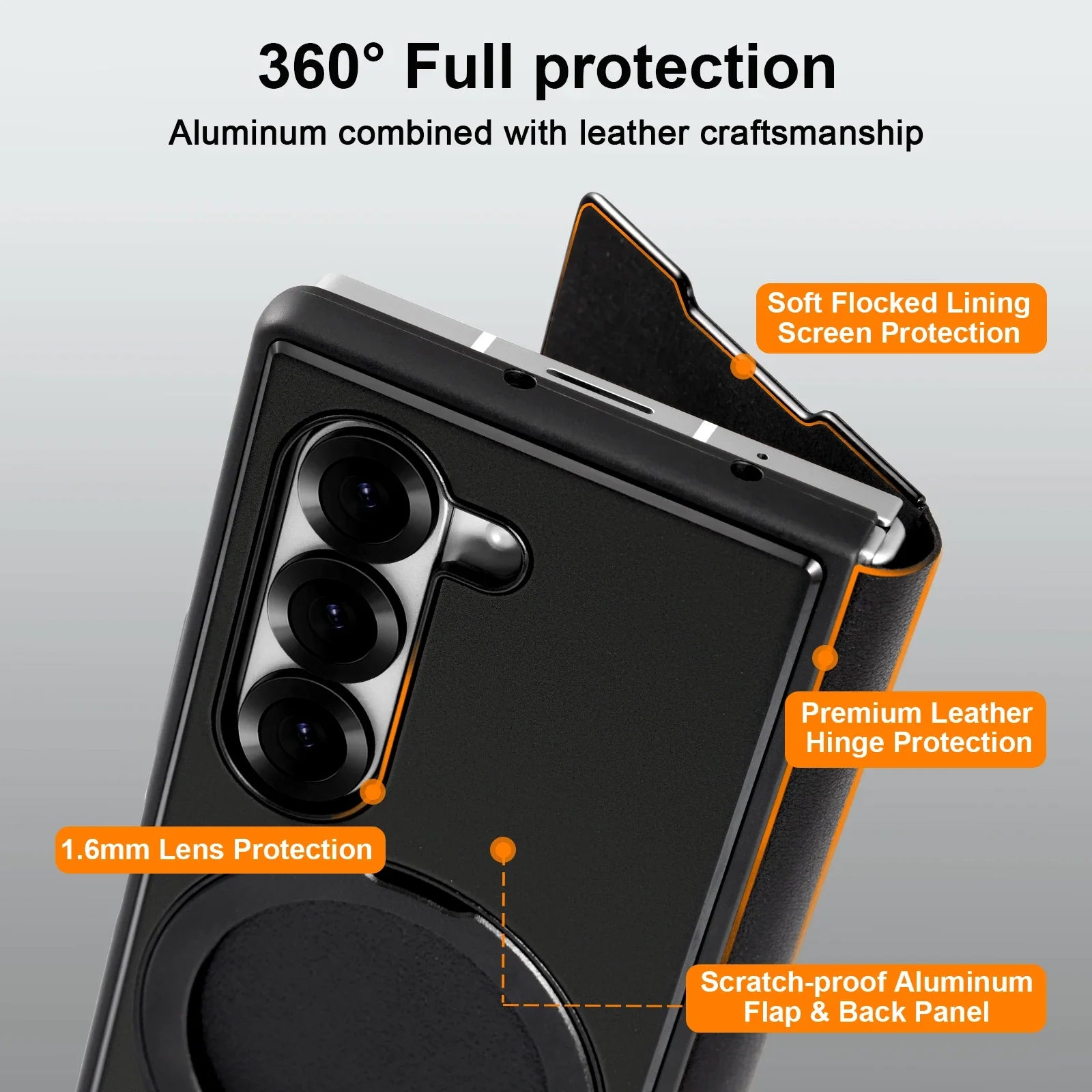 Protect your Galaxy Z Fold 6 or Fold 5 in style with the MagSafe Flip Phone Case, designed for full functionality and premium everyday use. Crafted with a durable aluminum frame and premium leather accents, it offers 360° protection against drops, scratches, and daily wear. The built-in 360° rotatable ring kickstand adds hands-free convenience for video calls or media viewing. Fully MagSafe-compatible, it supports wireless charging and attaches effortlessly to magnetic accessories like car mounts and wallets. Precision-cut and fold-friendly, this case enhances both the look and utility of your foldable phone.